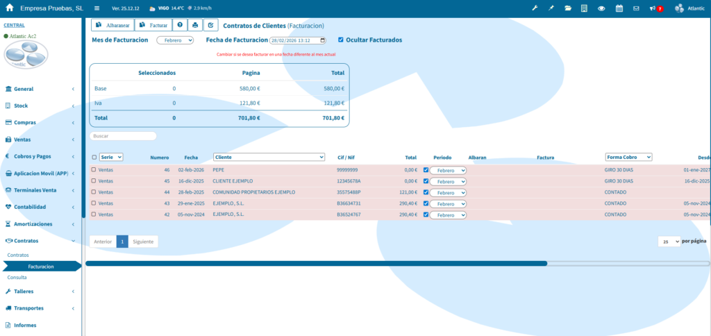 Gestiona la facturación asociada a los contratos de clientes, permitiendo generar albaranes, emitir facturas y realizar consultas de revisión con total comodidad.