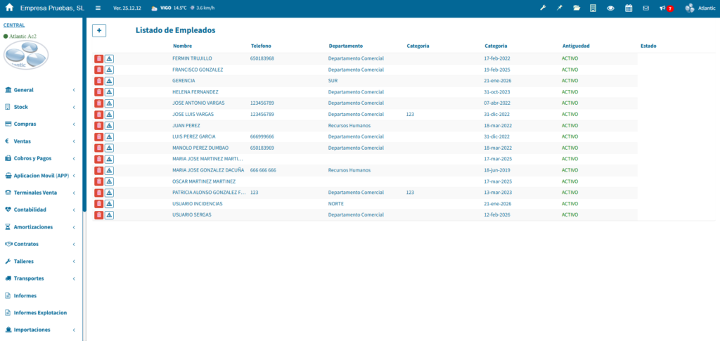 Consulta el registro completo de trabajadores con sus datos principales —nombre, teléfono, departamento, categoría, antigüedad y estado laboral— manteniendo toda la información del personal centralizada y actualizada.